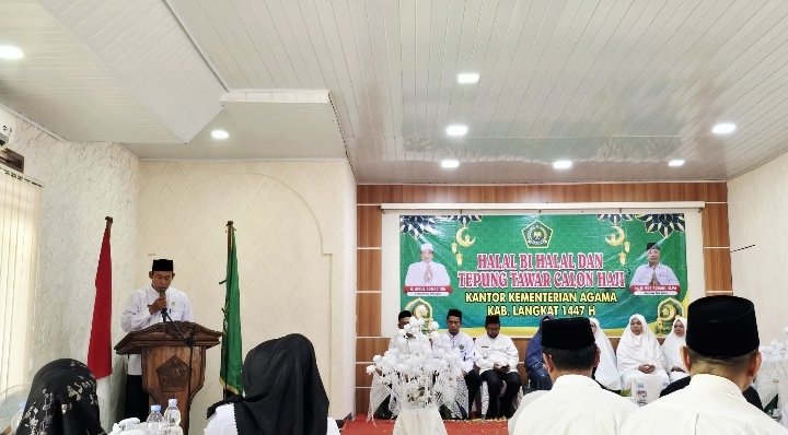 LANGKAT, (CNK) – Suasana haru dan penuh kebersamaan mewarnai acara halal bihalal yang dirangkaikan dengan prosesi tepung tawar bagi jama’ah calon haji di Aula kantor Kemenag Langkat, Selasa (7/4/2026).