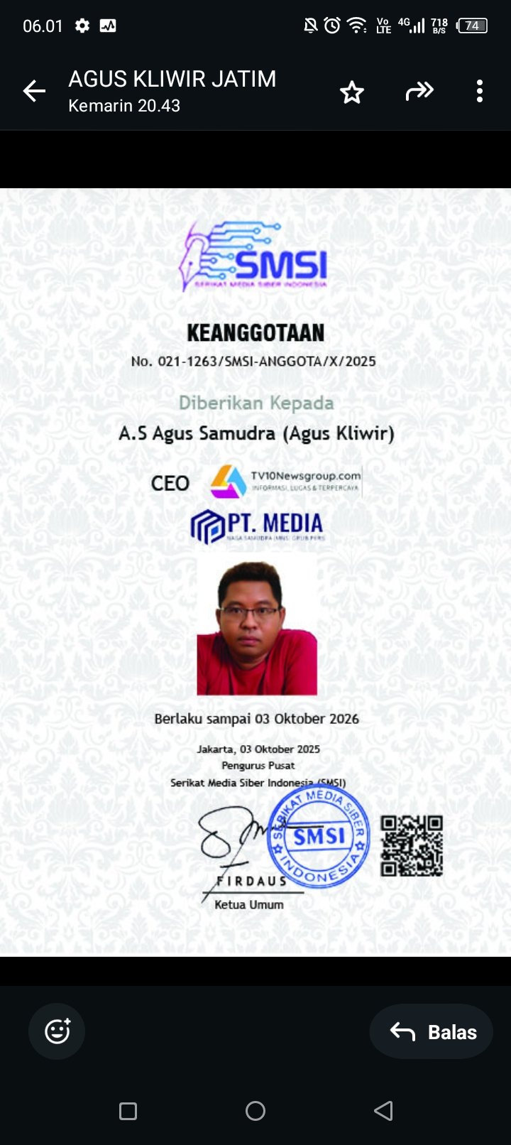 “Dengan bergabungnya www.tv10Newsgroup.com ke SMSI, diharapkan sinergi antar media siber semakin kuat dan kualitas jurnalisme terus meningkat,” ujar Agus Kliwir kepada wartawan, Jum’at (3/10/25).
