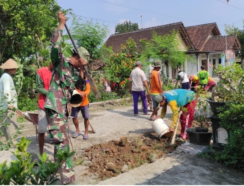 Sragen – Dalam upaya mengatasi kesulitan warga desa binaannya, Sertu Mukhamad Purwadi Babinsa Kaliwedi Koramil 06/Gondang Kodim 0725/Sragen melaksanakan Giat Bakti TNI bersama warga Dk. Belangan dengan sasaran bergotong royong melaksanakan Perbaikan jalan Dk. Belangan RT.03, Desa Kaliwedi, Kecamatan Gondang, Senin (27/03/2023).
