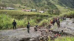Nduga Papua – Prajurit TNI Pos Grinbun Satgas Yonif RK 114/Satria Musara bersama masyarakat melaksanakan gotong royong membersihkan material longsor dan memperbaiki kondisi jalan yang rusak di Kampung Silan Distrik Dal Kabupaten Nduga. Rabu (2/2/2022).