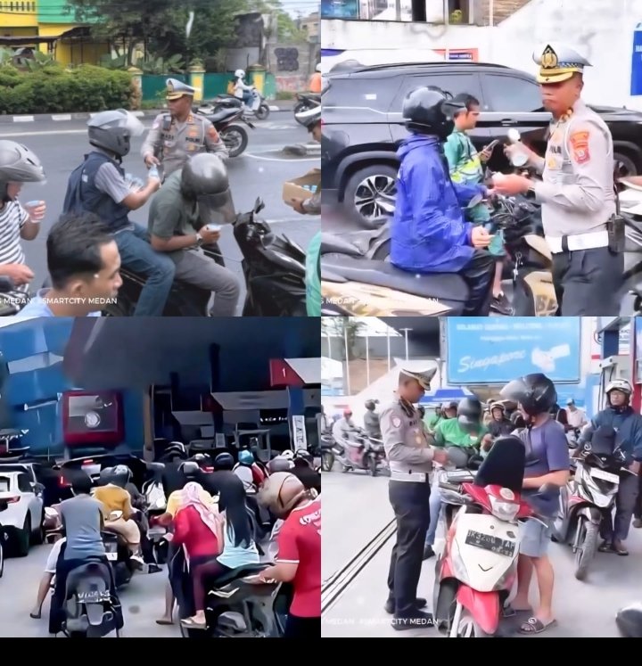 MEDAN, (CNK) – Aksi humanis Satlantas Polrestabes Medan tampak nyata saat membagikan air mineral kepada warga yang sedang mengantre bahan bakar minyak (BBM) di SPBU Pertamina 142011166 Singapore Station 2, Jalan H. Adam Malik No. 5, Medan, Selasa, 2 Desember 2025. Di tengah cuaca terik dan antrean panjang, kehadiran personel lalu lintas menjadi bentuk kepedulian langsung kepada masyarakat yang menunggu giliran pengisian BBM.