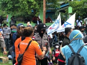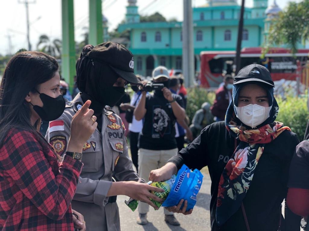 Bintan – Sejumlah Oknum Anggota Polisi Wanita (PolWan) melaksanakan aksi kolaborasi dengan massa pengunjuk rasa memberikan minuman dan permen kepada pengunjuk rasa di pintu masuk kawasan Industri Lobam pada Kamis (9/12/2021).