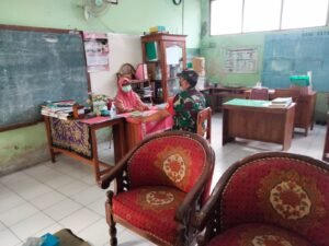 Sragen – Babinsa Desa Jurangjero Koramil 02/Karangmalang Kodim 0725/Sragen Sertu Bambang Agus melaksanakan Komunikasi Sosial (Komsos) dengan Kepala sekolah SD Jurangjero 2 Ibu Suparni di Dk.Candirejo Ds.Jurangjero Kecamatan, Karangmalang, Kamis (27/01/2022) Pukul 09.00 wib.