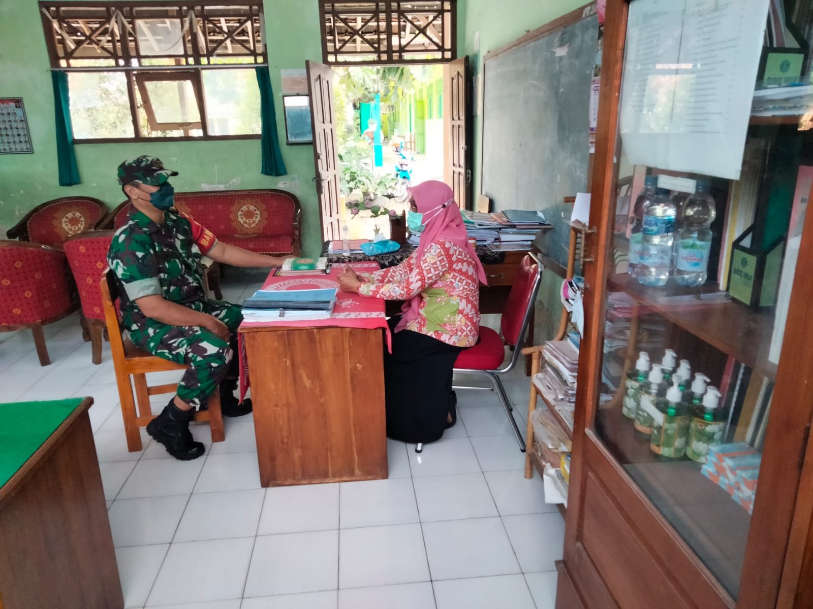Tidak lupa pula himbauan dari Babinsa kepada Kepala Sekolah untuk disampaikan kepada siswa siswi tentang Penerapan hidup sehat dan selalu cuci tangan, memakai Masker.
