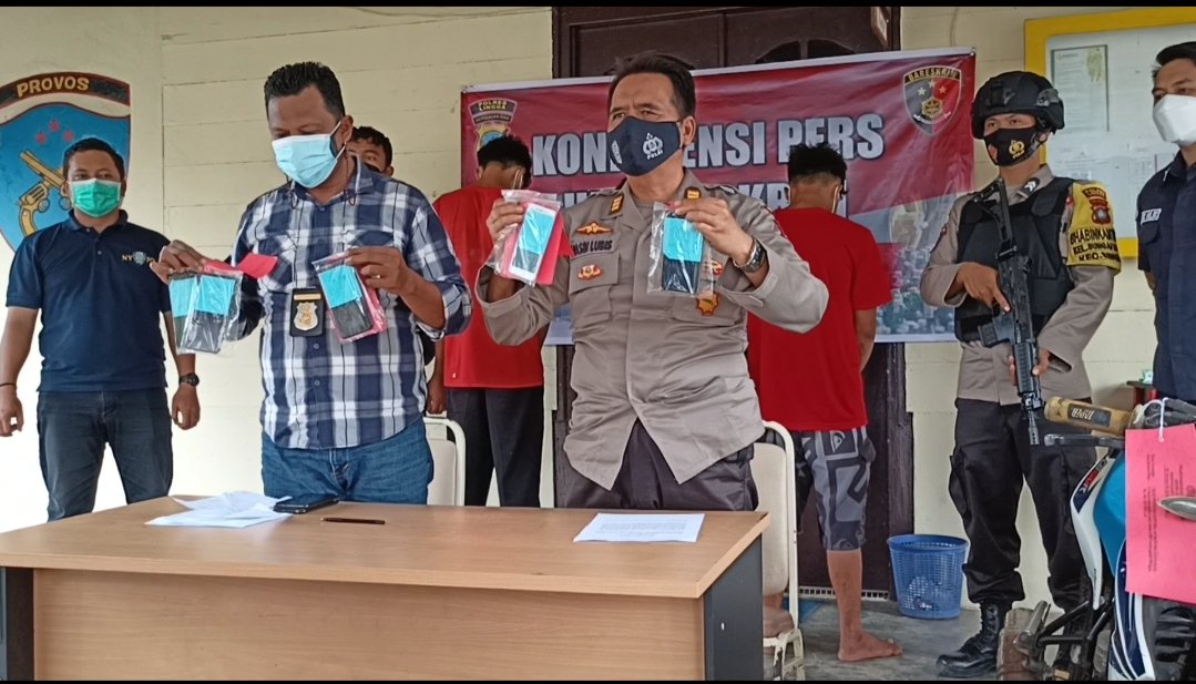 CAHAYANEWSKEPRI.COM – Gelar kegiatan konferensi pers diselenggarakan di Polsek Dabo Singkep dengan dihadiri Kasubag humas Polres Lingga AKP Hasbi Lubis dan Kanitreskrim Aiptu Sapri mewakili Kapolsek Dabo Singkep Iptu Akmadi menjelaskan, pada hari Jum’at 02 Juli 2021 diduga para tersangka melakukan tindak pidana pencurian di wilayah hukum Polsek Dabo Kecamatan Singkep tepatnya di Asrama Pondok Pesantren Baitul Qur’an yang terletak di Desa Tanjung Harapan, Kecamatan Singkep, Kabupaten Lingga dengan barang bukti yang diamankan berupa satu (1) unit handphone merk Samsung tipe M.31 warna ocean blue dan uang sebesar Rp.150.000 (seratus lima puluh ribu rupiah, terang Kanit Reskrim Polsek Dabo Singkep Aiptu Sapri MZ. S.Sos. Rabu 14/07/2021.