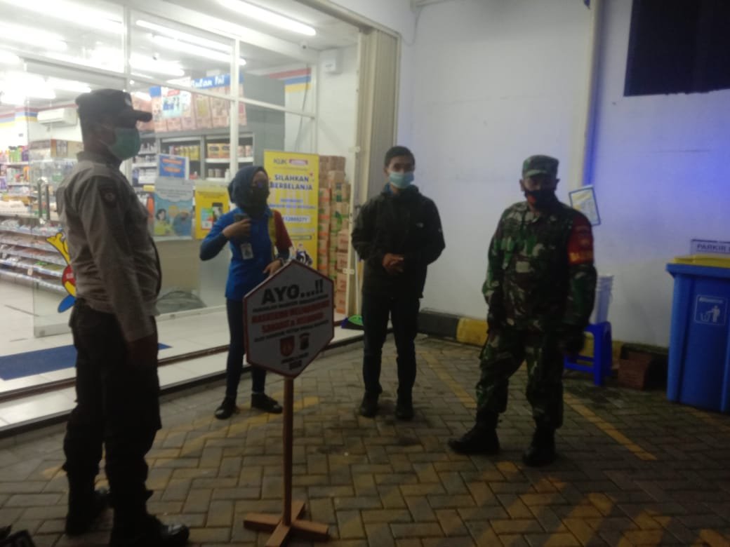 Boyolali – Babinsa Koramil 07/Selo Kodim 0724/Boyolali melalui Serka Made beserta satu orang Babinsa dan dua orang Babinkamtibmas Polsek Selo melaksanakan operasi Yustisi pada malam hari untuk menghambat laju penyebaran virus covid 19 di Alfamart dan sekitarnya di Dukuh Blumbangsari RT 04 RW 05 Desa Samiran Kecamatan selo Kabupaten Boyolali., Selasa Malam (28/12/2021).