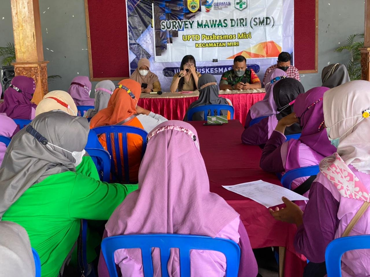 Dalam sambutannya dr. Eni Suramto dari Puskesmas Miri menyampaikan materi kegiatan Survei Mawas Diri (SMD) tentang kesehatan, ”Survey Mawas Diri (SMD) adalah survey yang dilakukan secara rutin untuk mengetahui permasalahan kesehatan di masyarakat dengan tujuan untuk mengetahui kebutuhan masyarakat di bidang kesehatan pada Tahun 2022 maka dari Puskesmas melakukan SMD (Survey Mawas Diri).