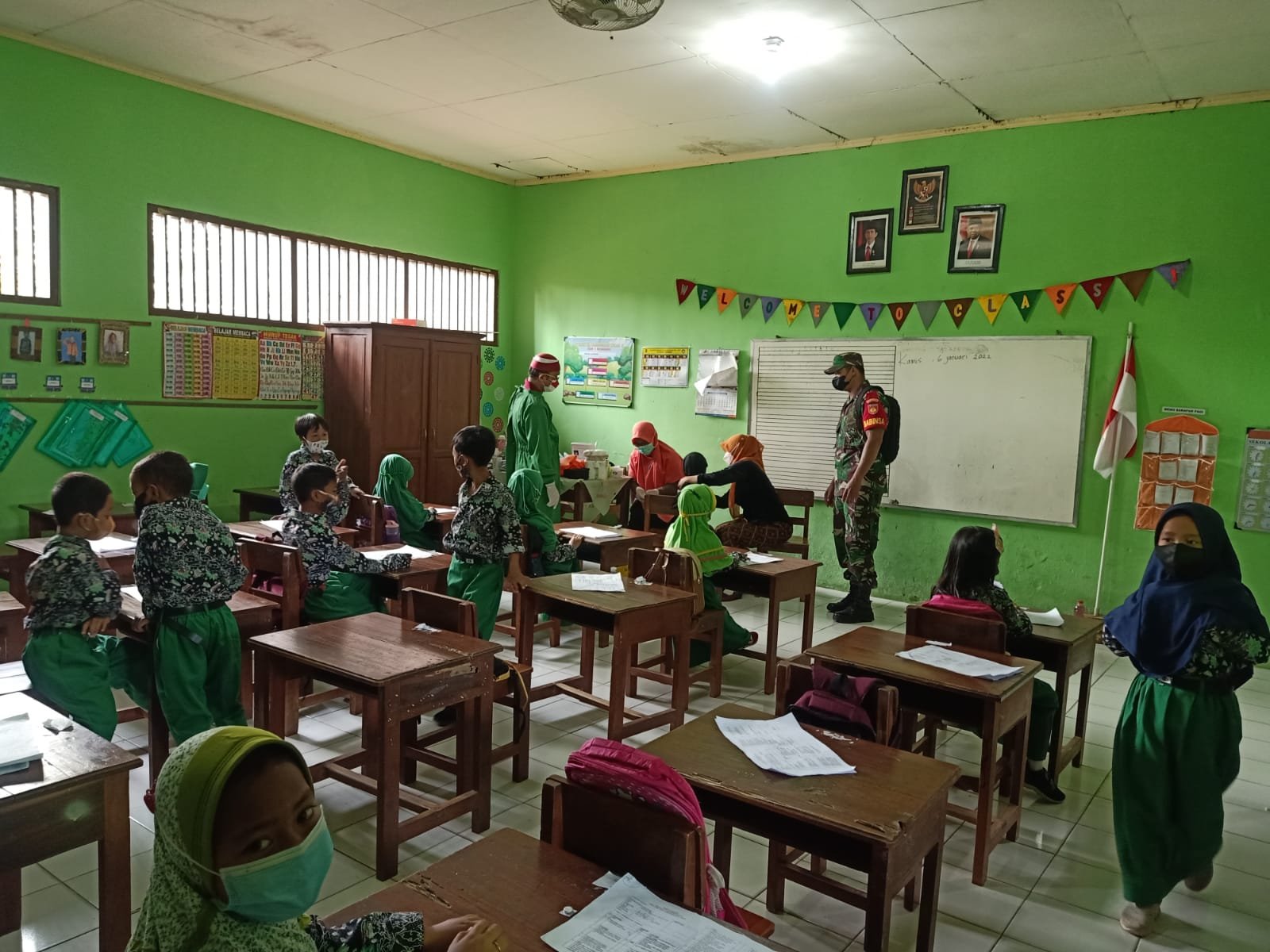 Boyolali – Babinsa Koramil 16/Karanggede Kodim 0724 Boyolali damping vaksinasi serentak untuk anak usia 6 sampai 11 tahun yang dilaksanakan di enam sekolah dasar di Kecamatan Karanggede yaitu TK Siwi peni, SD Sendang I, TK Dharma Putra, SD Sendang II, TK Aisyah Klimas dan SDN Klimas, Jumat ( 07/01/2022).