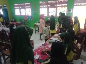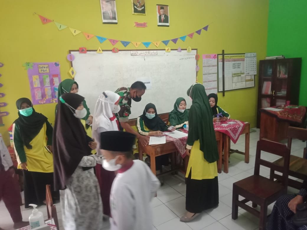 Boyolali – Babinsa Ketoyan Ramil 17/Wonosegoro Kodim 0724/Boyolali Koptu Agus Raharjo mengawal tenaga kesehatan pelaksana vaksin di Empat Sekolah Dasar yaitu SD Ketoyan, SDN Seworan, Mi Ketoyan dan SD Muhamadiyah Seworan, Kecamatan Wonosegoro Kabupaten Boyolali. Sabtu (22/01/2022).