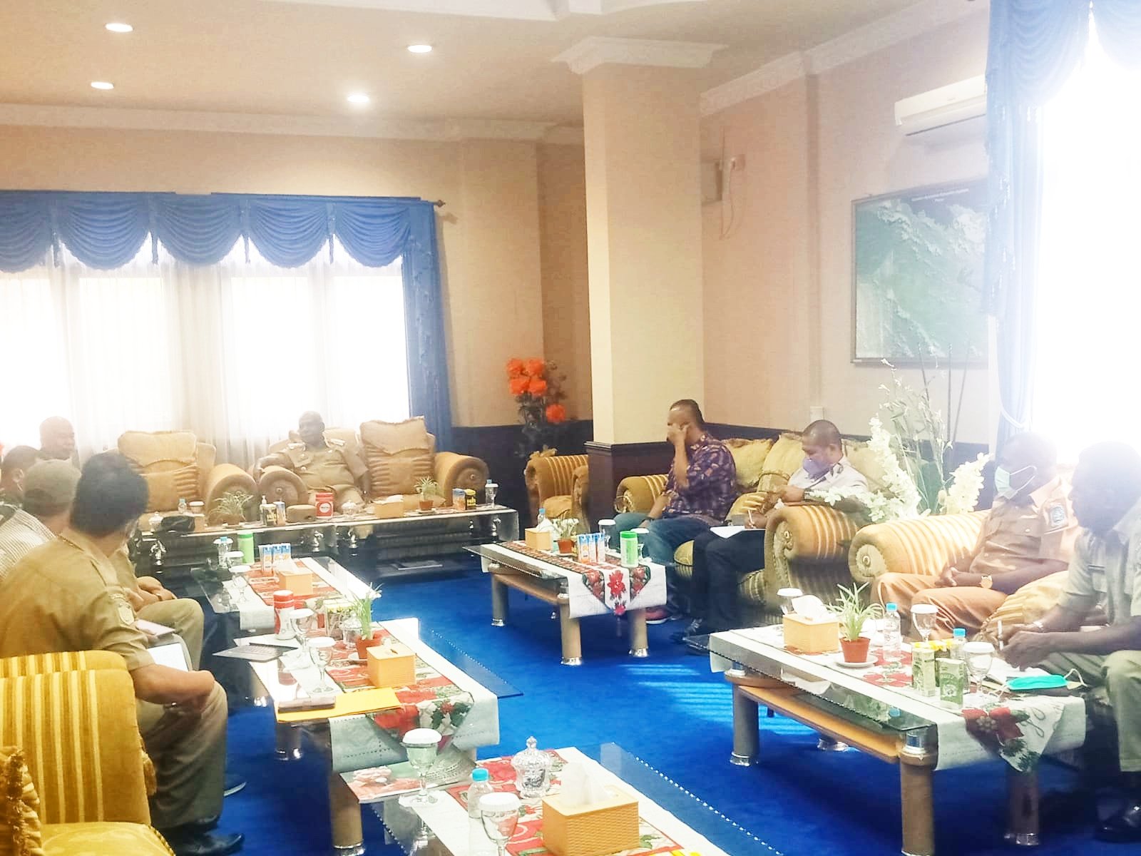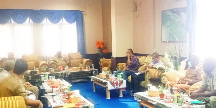 Sentani – Bupati Jayapura, Mathius Awoitauw, S.E., M.Si., didampingi Kepala Dinas Perkebunan dan Peternakan Kabupaten Jayapura, Ir. H. Sambodo Samiyana, M.Si., Kepala Dinas Tanaman Pangan dan Hortikultura Kabupaten Jayapura, David A. Zakaria, menerima kunjungan dari Komandan Kodim (Dandim) 1701/Jayapura Letkol Inf. Richard Arnold Yehezkiel Sangari, S.E., M.M., dalam kerjasama bidang pertanian dan perkebunan, di VIP Room Bupati Jayapura, Gunung Merah, Sentani, Kabupaten Jayapura, Senin (24/1/2022).