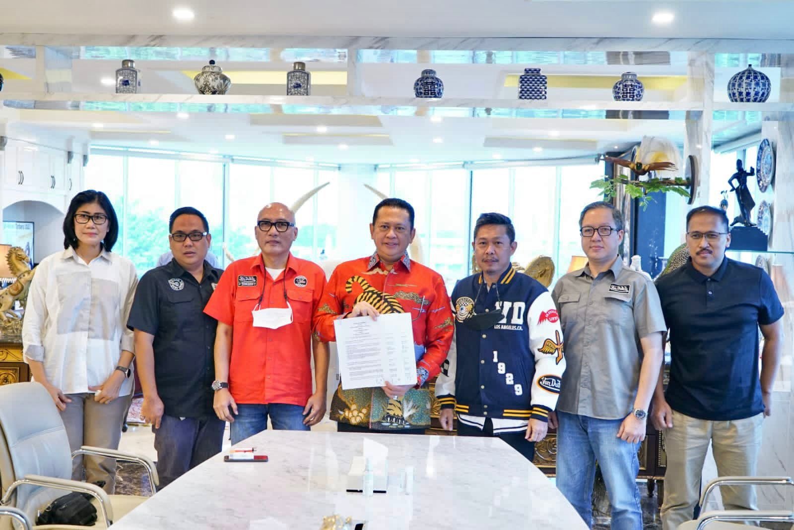 Jakarta – Ketua MPR RI sekaligus Ketua Umum Ikatan Motor Indonesia (IMI) Bambang Soesatyo bersama Direktur Utama PT Garuda Bersatu Semesta Deddy Sidik dan Direktur PT Bekarya Otomotif Sukses Djoko Iman Santoso menandatangani Perjanjian Kemitraan untuk memajukan Black Stone Garage – IMI Lounge yang terletak di kawasan Kebayoran Baru, Jakarta Selatan.