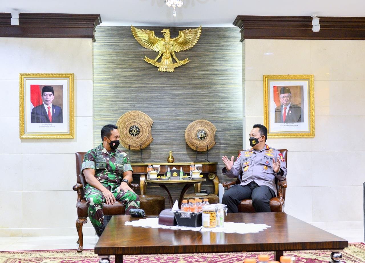 Jakarta – Panglima TNI Jenderal Andika Perkasa menyambangi Kapolri Jenderal Listyo Sigit Prabowo di Mabes Polri, Jakarta Selatan, Selasa (23/11/2021). Dalam kesempatan itu, kedua Jenderal tersebut salah satunya membahas soal ditingkatkannya sinergitas dan soliditas TNI-Polri.