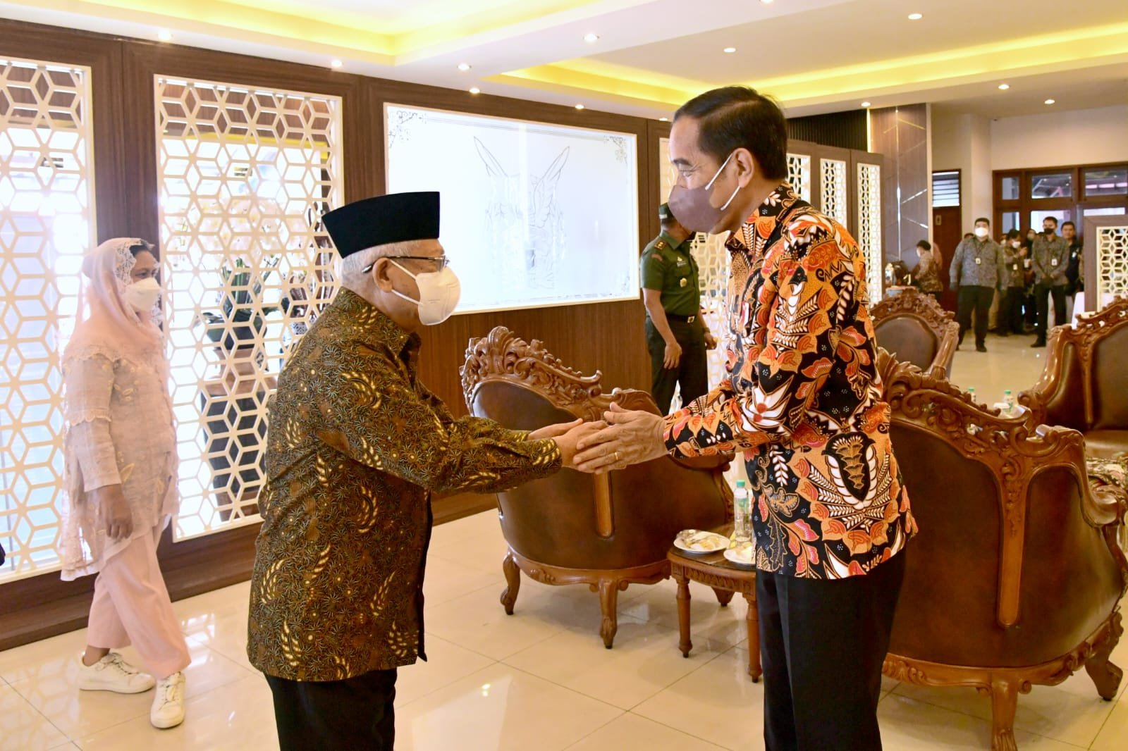 Surakarta – Siang ini, Wakil Presiden (Wapres) K.H. Ma’ruf Amin bertemu dengan Presiden Joko Widodo (Jokowi) di Pangkalan Udara TNI AU Adi Soemarmo, Kabupaten Boyolali, Jawa Tengah, Senin, (21/11/2022). Kedua pemimpin bertemu di ruang tunggu VVIP sesaat sebelum lepas landas menuju Pangkalan Udara TNI AU Halim Perdanakusuma, Jakarta, usai melaksanakan kunjungan kerja di Surakarta.