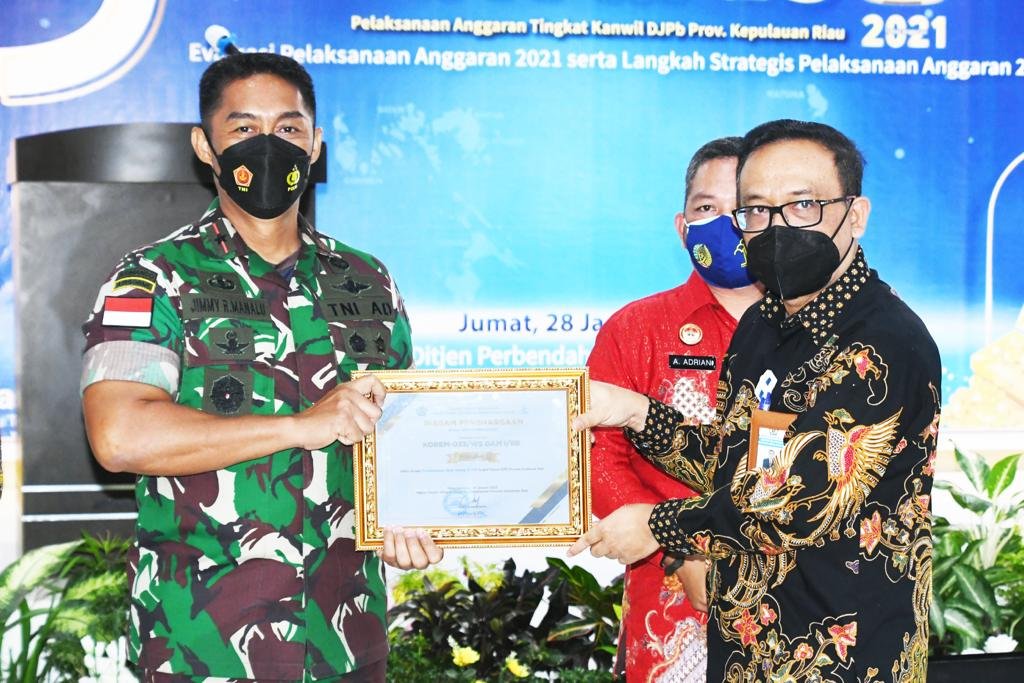 Anugerah tersebut diserahkan langsung oleh Kepala Kanwil DJPp Kepri Bapak Indra Soeparjanto, SE. M.A.P. Sedangkan dalam kategori penyerapan anggaran terbaik dengan pagu besar selama pelaksanaan anggaran tahun 2021, Korem 033/WP menempati peringkat ke 4 (empat).