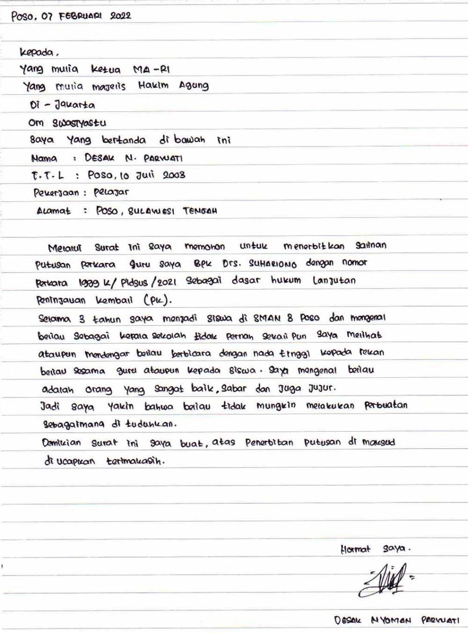 Jakarta – Sebanyak 95 siswa SMA Negeri 3 Poso bersama 14 orang alumni sekolah ini mengirimkan surat permohonan kepada Ketua Mahkamah Agung (MA) agar kiranya MA segera memberikan salinan putusan kasasi atas vonis 4,5 tahun penjara yang ditimpakan kepada guru mereka Drs. Suhariono. Turut juga mengirimkan surat permohonan ke Ketua MA, 2 orang rekan guru SMAN 3 Poso, atas nama I Putu Sudama (51) dan Hendro Firgiawan Fristanto (31).