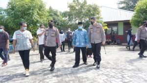 Lingga, Kepri – Bupati Lingga, Muhammad Nizar, S.Sos bersama dengan Kapolres Lingga, AKBP Arief Robby Rachman, S.H., S.I.K., M.Si meninjau langsung jalannya vaksinasi massal pada Gerai vaksinasi Presisi yang dilakukan pihak Polsek Daik, di SMPN 1 Lingga, Kamis (08/07/2021).