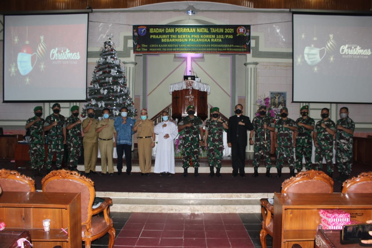 Palangka Raya – Keluarga besar Korem 102 Panju Panjung melaksanakan kegiatan perayaan Natal dengan tema “Personil TNI siap mewujudkan cinta kasih kristus dalam persaudaraan”, Selasa, 18 Januari 2022.