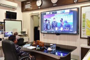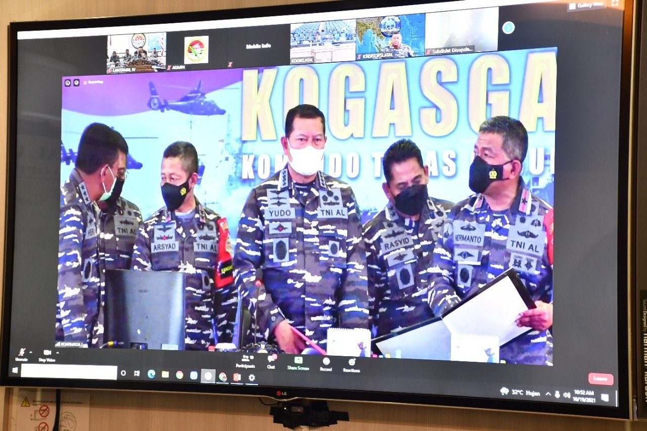 Lantamal IV (Tanjungpinang) – Komandan Pangkalan Utama TNI Angkatan Laut IV Tanjung pinang (Danlantamal IV Tanjung pinang) Laksamana Pertama TNI Dwika Tjahja Setiawan, S.H., M.H., bersama Asintel Danlantamal IV, Asops Danlantamal IV dan Kadiskes Lantamal IV melalui video conference (vicon) mengikuti Kepala Staf Angkatan Laut (Kasal) Laksamana TNI Yudo Margono, S.E., M.M., acara peninjauan TFG kesiapan Latihan Opsfib TNI Angkatan Laut dan rencana Serbuan Vaksinasi Maritim yang berlangsung di Ruang Kendali Utama (RKU) Mako Lantamal IV Jl. Yos Sudarso No.1 Batu Hitam Tanjung pinang Kepri, Selasa pagi (19/10/2021).