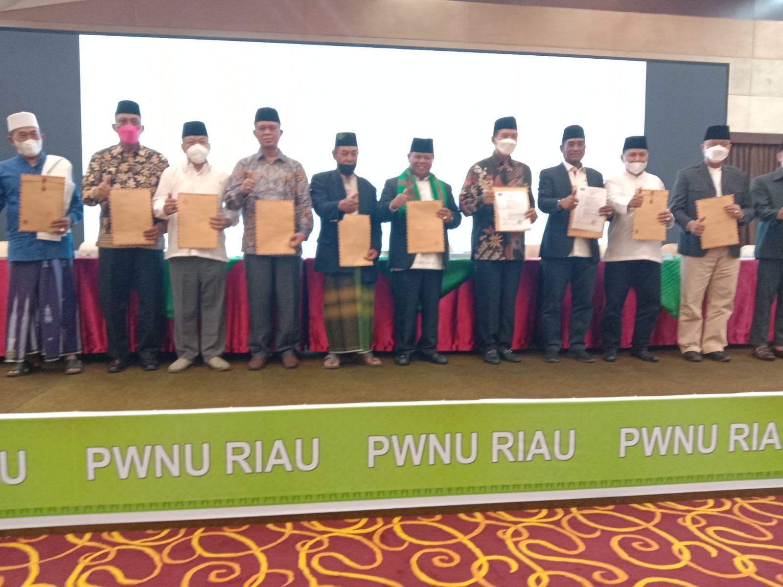 Pekanbaru – Pengurus Wilayah Nahdlatul Ulama Provinsi Riau menggelar Rapat Perdana PWNU Riau Dengan PCNU Se-Riau sekaligus penyerahan SK Pengurus Wilayah Nahdlatul Ulama Provinsi Riau masa khidmat 2021-2026 di Ballroom Dang Merdu Gedung Bank Riau Kepri lantai 4 jalan Jendral Sudirman kota Pekanbaru, Sabtu malam (15/1/22).