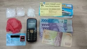 ″Barang bukti yang berhasil diamankan adalah 1 bungkus plastik bening yang didalamnya terdapat plastik berwarna Merah yang berisikan 3 buah plastik bening berisikan serbuk kristal diduga Sabu seberat total 15,28 gram, 1 unit Handphone merk Nokia Model 103 Warna Hitam, 1 lembar KTP milik tersangka Inisial N alias Y alias G, 1 lembar tiket kapal ferry Dumai express dari Tanjung balai Karimun menuju Batam, Uang tunai sebesar Rp.75.000,-″. Ucap Kabid Humas Polda Kepri Kombes Pol Harry Goldenhardt S., S.IK., M.Si.