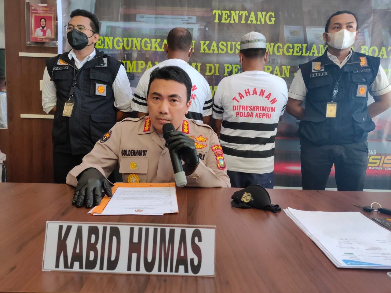Batam – Dua orang penampung atau pengurus Pekerja Migran Indonesia Inisial JI Alias J dan Inisial AS Alias AB diamankan oleh tim gabungan Dit Reskrimum Polda Kepri dan Polres Bintan. Dua orang tersangka ini yang melakukan pengurusan pengiriman Pekerja Migran Indonesia Ilegal yang mengalami kecelakaan kapal di Johor Bahru, Malaysia beberapa waktu yang lalu, dalam kecelakaan kapal tersebut mengakibatkan korban meninggal dunia sebanyak 21 orang dan 25 orang masih dalam pencarian. Hal tersebut disampaikan oleh Kabid Humas Polda Kepri Kombes Pol Harry Goldenhardt S., S.IK., M.Si, didampingi Dir Reskrimum Polda Kepri Kombes. Pol. Jefri Ronald Parulian Siagian, S.I.K., M.Si dan Kasubdit IV Dit Reskrimum Polda Kepri AKBP Achmad Suherlan, S.Ik saat Konferensi Pers di Polda Kepri. pada Senin (27/12/2021).