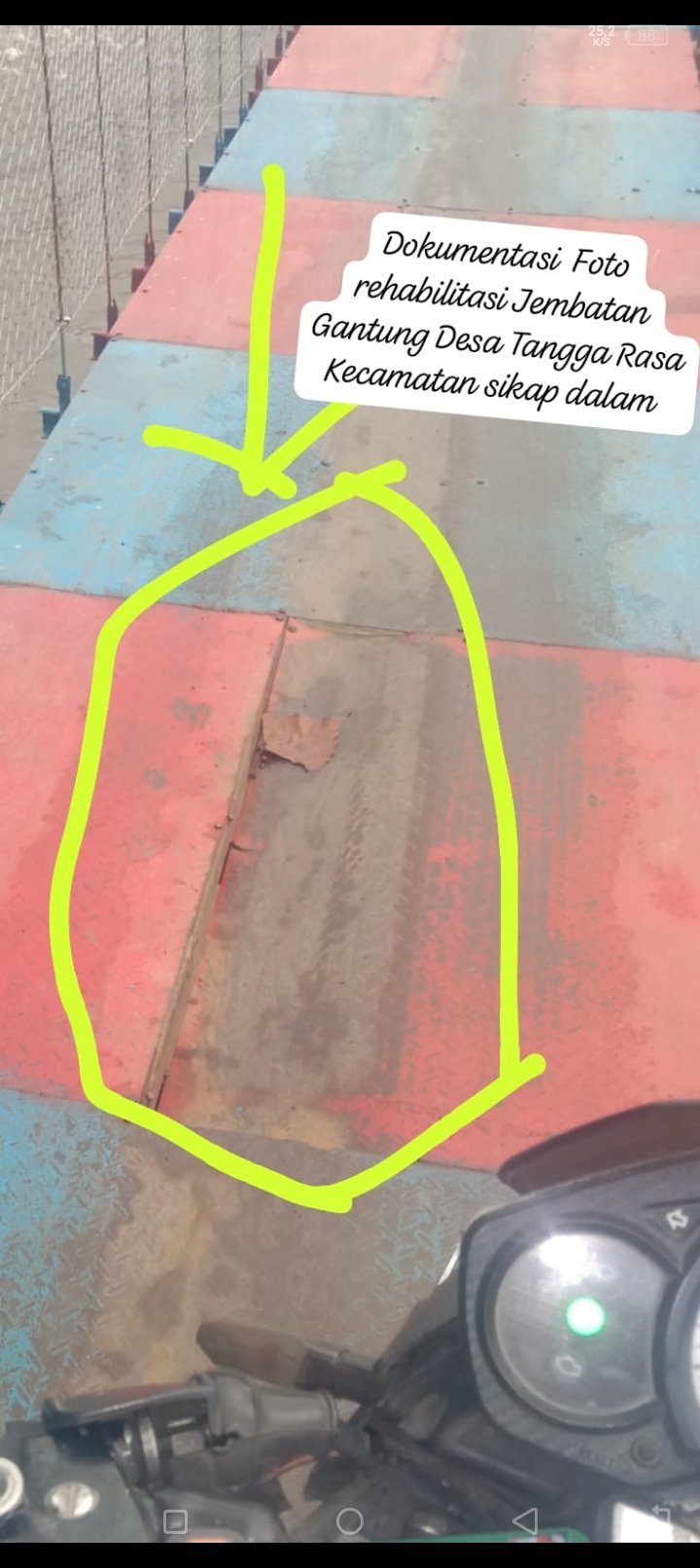 SIKAP DALAM, EMPAT LAWANG (CNK) – Proyek rehabilitasi Jembatan Gantung di Desa Tangga Rasa, Kecamatan Sikap Dalam, Kabupaten Empat Lawang diduga mengalami mark up atau praktik fiktif, setelah permukaan jembatan menunjukkan kerusakan yang cukup jelas hanya dua bulan setelah pekerjaan diselesaikan. Kondisi tersebut membuat masyarakat khawatir karena hasil yang diterima jauh dari ekspektasi meskipun telah dikeluarkan anggaran yang tidak sedikit.