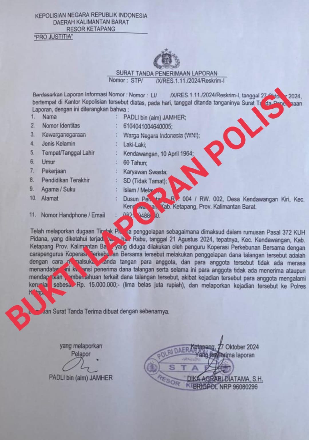 KETAPANG, KALBAR – Akibat gejolak dugaan penggelapan dana talangan anggota koprasi ,degan cara memasukan tanda tanggan anggotanya, hingga memicu kemarahan anggotanya,” Puluhan Anggota Koperasi Perkebunan Bersama Kecamatan Kendawangan berbondong bondong minta keadilan hukum dan hak hak mereka degan melaporkan pengurus inti koperasi diantaranya (Ketua, Sekretaris, Bendahara) ke Polres Ketapang akibat mengelapkan dana talangan, anggotanya pada hari Minggu 27 Oktober 2024, ke Mapolres Ketapang.