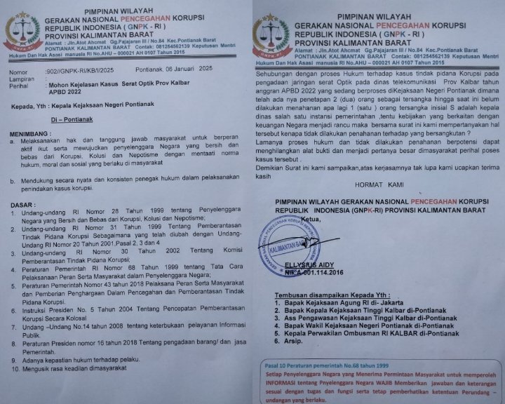 CAHAYANEWSKEPRI.COM – Gerakan Nasional Pencegahan Korupsi Republik Indonesia (GNPK RI) wilayah Kalimantan Barat melayangkan surat kedua pada Senin (6/1/2025) untuk mempertanyakan langkah Kejari.