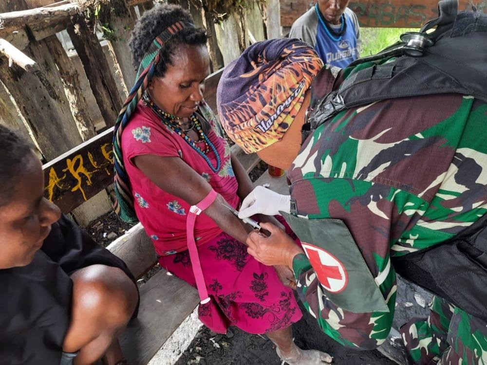 Mbua Nduga – Prajurit TNI Satgas Yonif RK 114/Satria Musara memberikan pelayanan kesehatan gratis kepada warga asli Papua di daerah pedalaman Papua, pegunungan tengah Distrik Mbua Kabupaten Nduga.