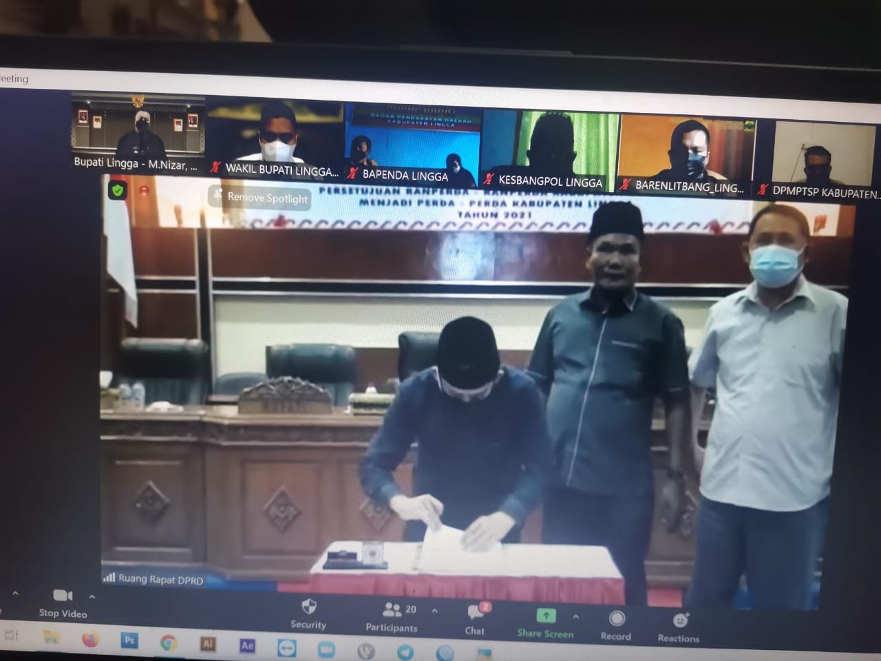 Lingga – Bupati Lingga, Muhammad Nizar menghadiri rapat Paripurna DPRD tahun 2021 secara virtual di gedung daerah, Daik Lingga, Senin (23/08/2021). Rapat membahas tentang agenda persetujuan ranperda – ranperda menjadi Peraturan Daerah (Perda) Kabupaten Lingga.