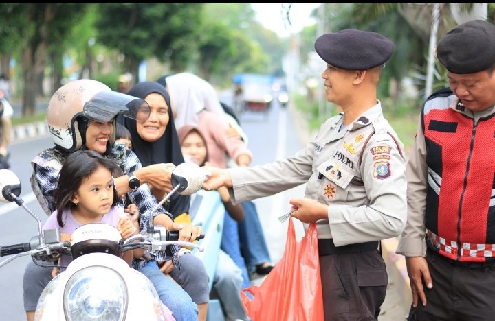 Selain berbagi, personel juga memberikan imbauan kepada masyarakat agar selalu tertib berlalu lintas dan mengutamakan keselamatan dalam berkendara, terutama menjelang waktu berbuka puasa.