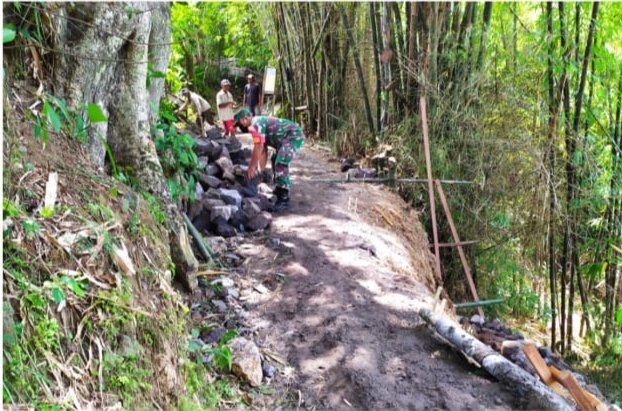 Sragen – Babinsa Koramil 16/Miri Kodim 0725/Sragen Serda Rohmadi bersama masyarakat Desa Doyong, Kecamatan Miri, Kabupaten Sragen, melaksanakan kegiatan Kerja Bakti pembuatan talud jalan di Desa Doyong, (19/1/2022) pagi.