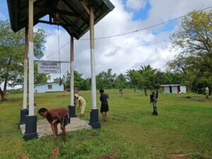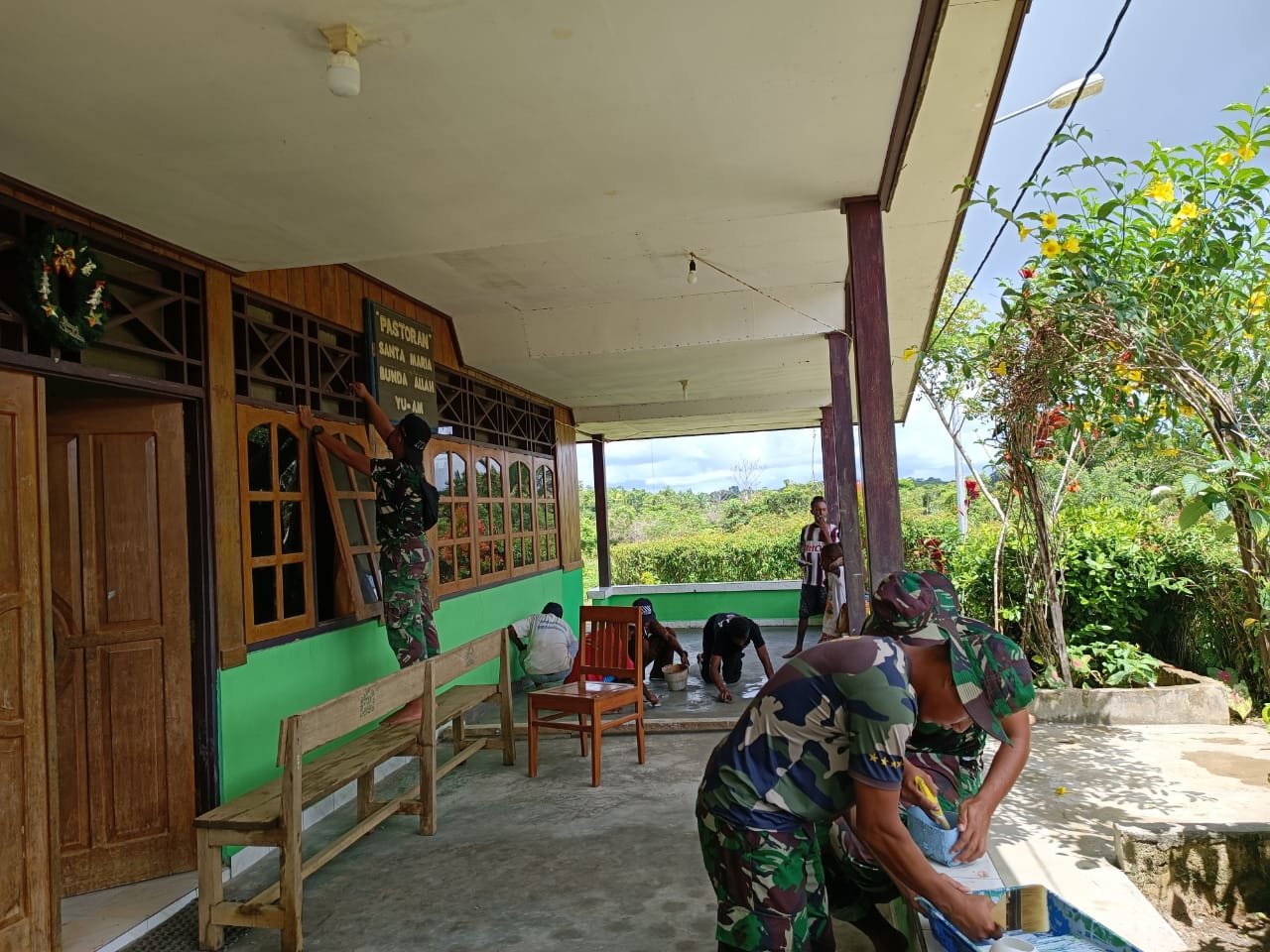 Keroom – Pos Yuruf Satgas Pamtas RI-PNG Yonif 126/KC bersama masyarakat dan jemaat melaksanakan kegiatan Karya Bakti yang berlangsung di Gereja Santa Maria Bunda Allah Kampung Yuruf, Distrik Yaffi, Kabupaten Keerom, Papua.