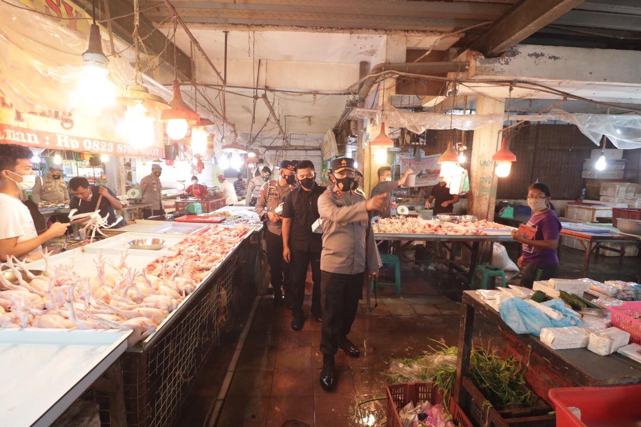 Batam, Kepri – Kapolda Kepri Irjen Pol Dr. Aris Budiman M.Si pimpin meninjau langsung situasi kamtibmas dan pembagian masker kepada masyarakat pengunjung pasar Botania I, Senin (3/5/21).