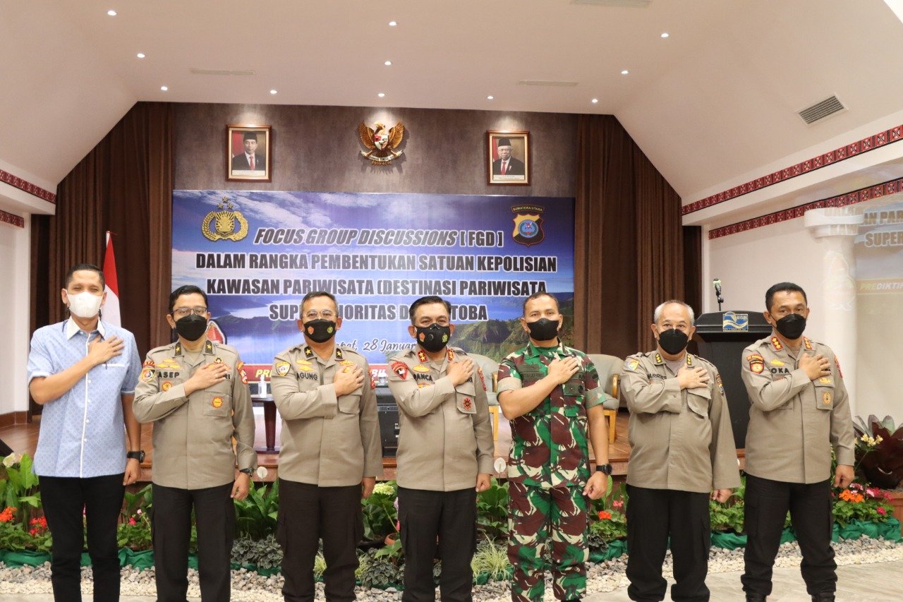 Simalungun – Kapolda Sumatera Utara (Sumut) Irjen. Pol. Drs. R. Z. Panca Putra S, M.Si menghadiri sekaligus membuka langsung acara Focus Grup Discussions (FGD) dalam rangka Pembentukan Satuan Kepolisian Kawasan Pariwisata (Destinasi Pariwisata Super Prioritas Danau Toba) didampingi Kapolres Simalungun AKBP Nicolas Dedy Arifianto, S.H, SIK., yang bertempat di Aula Sopo Bolon Niagara Hotel, Parapat Kecamatan Girsang Sipangan Bolon, Kabupaten Simalungun. Jum’at (28/1/2022) sore sekira pukul 17.00 WIB.