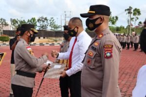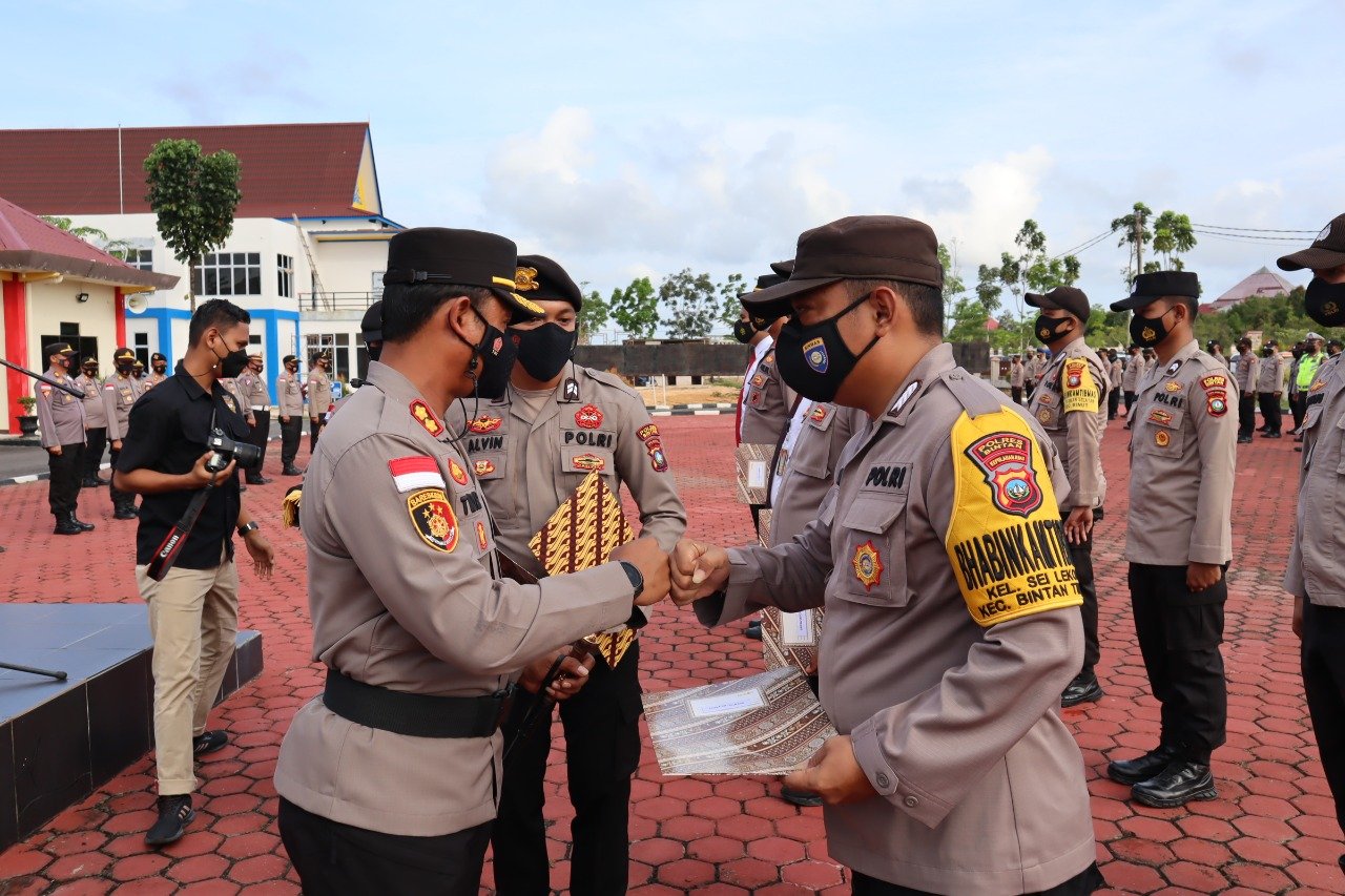 Bintan – Kapolres Bintan AKBP Tidar Wulung Dahono, S.H., S.I.K., M.H. memberikan piagam penghargaan kepada personil Polres Bintan yang berprestasi selama tahun 2021, Pemberian penghargaan tersebut dilaksakan dalam Upacara di Polres Bintan pada Rabu (22/12/2021).