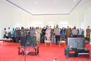 Karimun – Kapolres Karimun AKBP Tony Pantano, SIK, SH bersama Bupati dan FKPD kabupaten karimun mengikuti kegiatan Vicon bersama Presiden RI Ir. H. Joko Widodo dalam rangka peninjauan vaksinasi Booster di kepulauan Riau. Selasa (25/01/2022).