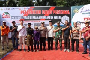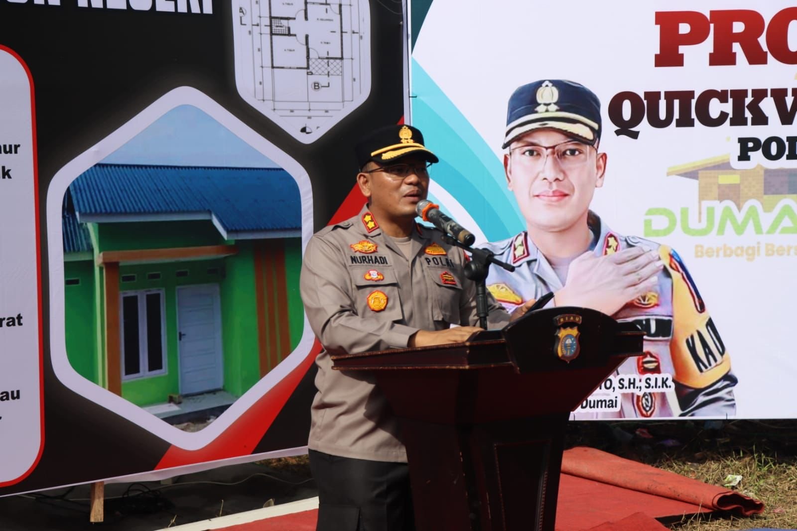 Dumai – Kapolres Dumai AKBP Nurhadi Ismanto melaunching program Berbagi Bersama Membangun Negeri (Berseri) dengan peletakan batu pertama bedah rumah keluarga Adnan (60 tahun) di Jalan Mesjid RT. 005 Kelurahan Pelintung, Kecamatan Medang Kampai, Sabtu (26/11/2022).