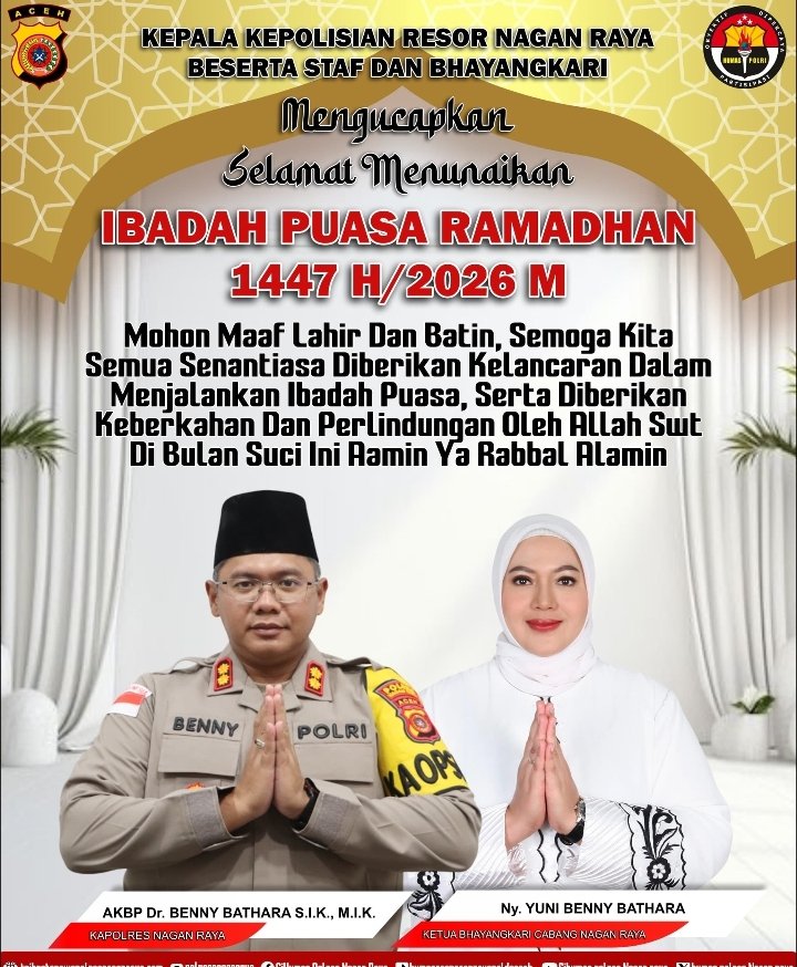NAGAN RAYA, (CNK) – Menyambut datangnya Bulan Suci Ramadhan 1447 Hijriah/2026 Masehi, AKBP Dr. Benny Bathara selaku Kapolres Nagan Raya bersama jajaran staf serta Bhayangkari Cabang Nagan Raya menyampaikan ucapan selamat menunaikan ibadah puasa kepada seluruh masyarakat.