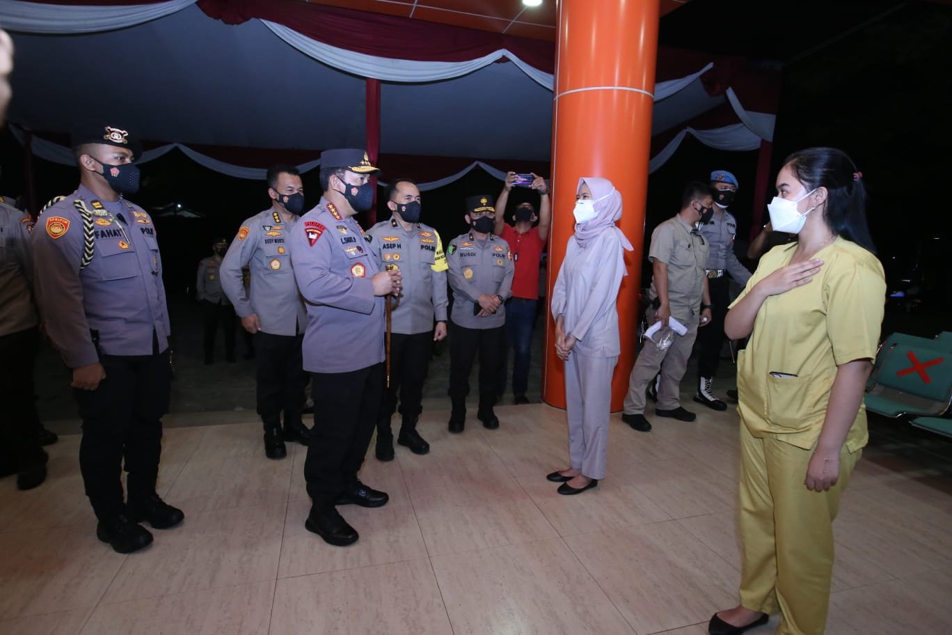 Kapolri mengecek langsung ruangan yang digunakan untuk ruang perawatan pasien Covid-19 mulai dari lantai Basement hingga lantai 4, disetiap ruangan Kapolri mengecek proses dan alur periksaan yang dilakukan oleh Dokter dan perawat, dan tak lupa Kapolri mengucapkan terima kasih banyak atas dedikasinya dalam merawat pasien serta Kapolri memberikan semangat kepada para Dokter dan Perawat yang bertugas.
