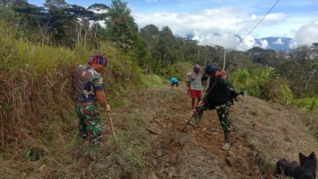 Palangka Raya – Personel Kodim 1016 Palangkaraya yang sedang melaksanakan BKO Satgas Teritorial Indonesia Timur, melaksanakan Komunikasi Sosial (Komsos) melalui kegiatan kerja bakti perbaikan jalan di desa tempat tugasnya.