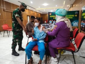 Sukoharjo – Kodim 0726/Sukoharjo kembali menggelar serbuan vaksinasi covid-19, kali ini untuk anak usia 6-11 tahun di Aula Kodim Sukoharjo, dengan menggunakan vaksin jenis sinovac, Senin (27/12/2021).