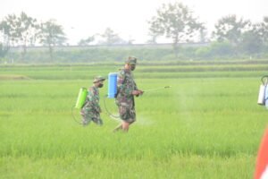 “Penyemprotan pada tanaman padi ini merupakan kegiatan dalam perawatan yang wajib dilakukan yang bertujuan untuk cegah dini atau mengantisipasi adanya serangan hama seperti wereng coklat, ulat penggulung daun, walang sangit maupun hama lainnya,” ujar Praka Budi Handoyo