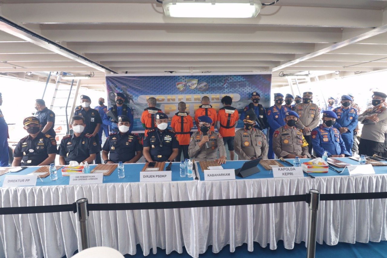 Batam – Kapal Patroli Dit Polairud Baharkam Polri KP. Bisma-8001 berhasil mengamankan 4 Unit Kapal Ikan Asing (KIA) berbendera Vietnam yang tengah melakukan pencurian ikan di laut Natuna Utara dan Hal tersebut disampaikan oleh Kabaharkam Polri Komjen. Pol. Drs. Arief Sulistyanto, M.Si didampingi oleh Kakorpolairud Baharkam Polri Irjen Pol Drs. Verdianto I. Bitticaca, M.Hum, Kapolda Kepri Irjen Pol Dr. Aris Budiman M.Si, Dirpolair Korpolairud Baharkam Polri Brigjen. Pol. Mohammad Yassin Kosasih, S.I.K., M.Si, Direktur Jenderal Pengawasan Sumber Daya Kelautan dan Perikanan Laksamana Muda TNI Adin Nurawaluddin, Dir Pemantauan dan Operasi Armada, Direktur PP, Kepala KPU Bea Cukai Batam, saat Konferensi Pers di Dermaga Pelabuhan Batu Ampar, Kota Batam. Selasa (31/8/2021).