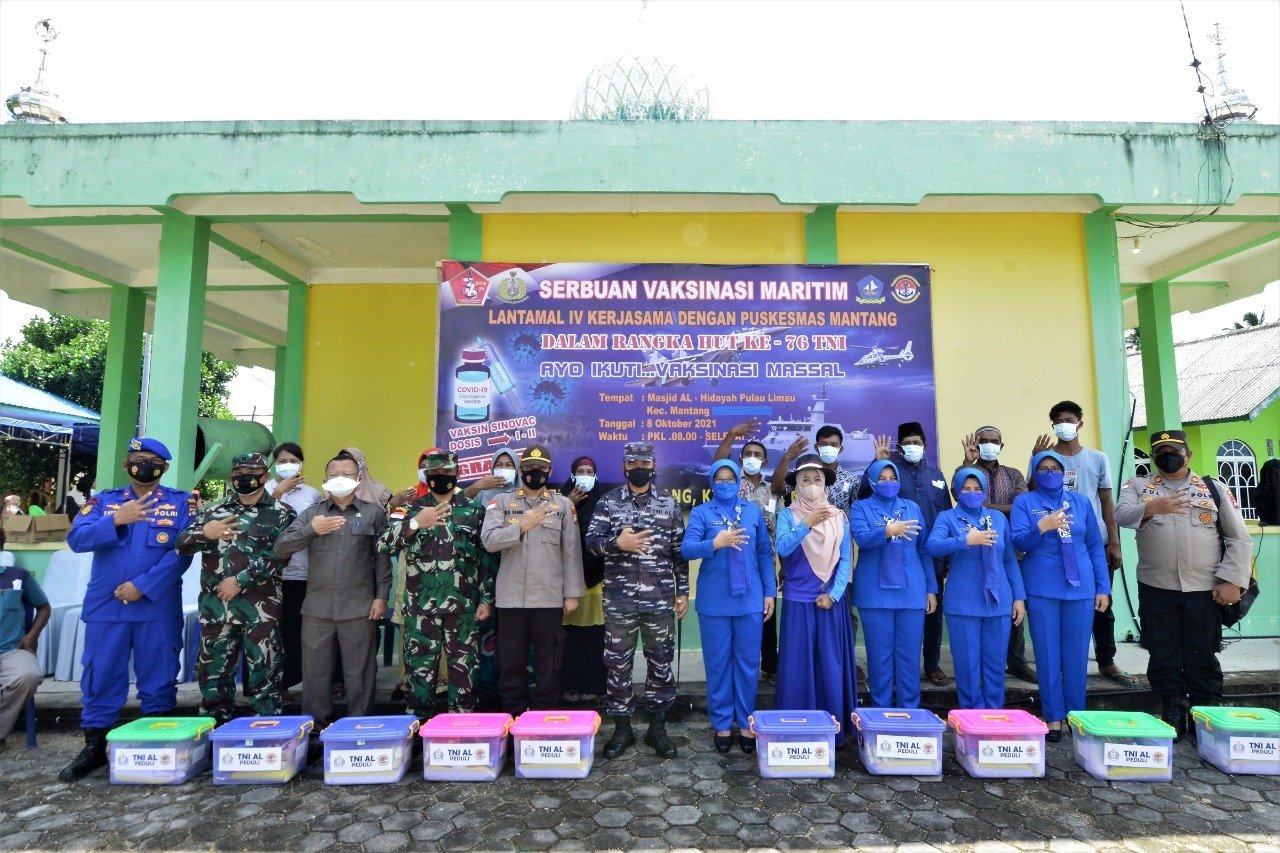 Lantamal IV (Bintan) – Pangkalan Utama TNI Angkatan Laut IV (Lantamal IV) kembali menggelar Serbuan Vaksinasi Maritim kepada masyarakat maritim yang berada di pulau terpencil yaitu di Pulau Limau Kecamatan Mantang Kabupaten Bintan Kepulauan Riau, Jumat pagi (08/10/2021).