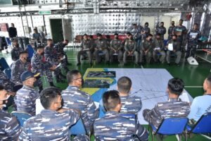 Surabaya – Jelang sehari pelaksanaan, Satgas Bhinneka Eka Bakti atau BEB yang dikomandani oleh Kolonel Laut (P) Sumarji Bimoaji menggelar Tactical Floor Game atau TFG di Geladak Heli KRI Surabaya-591, pada Selasa (04/01/2022).