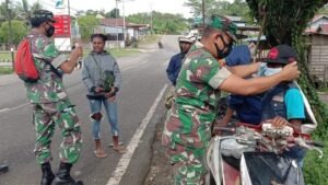Sorong Papua Barat – Koramil 1802-06/Klamono dipimpin Pelda Zaini bersama 9 anggota Babinsa melaksanakan komunikasi sosial dangan menghimbau Prokes dan pembagian masker kepada warga Distrik Klamono, Kabupaten Sorong. Jumat (07/01/2022).