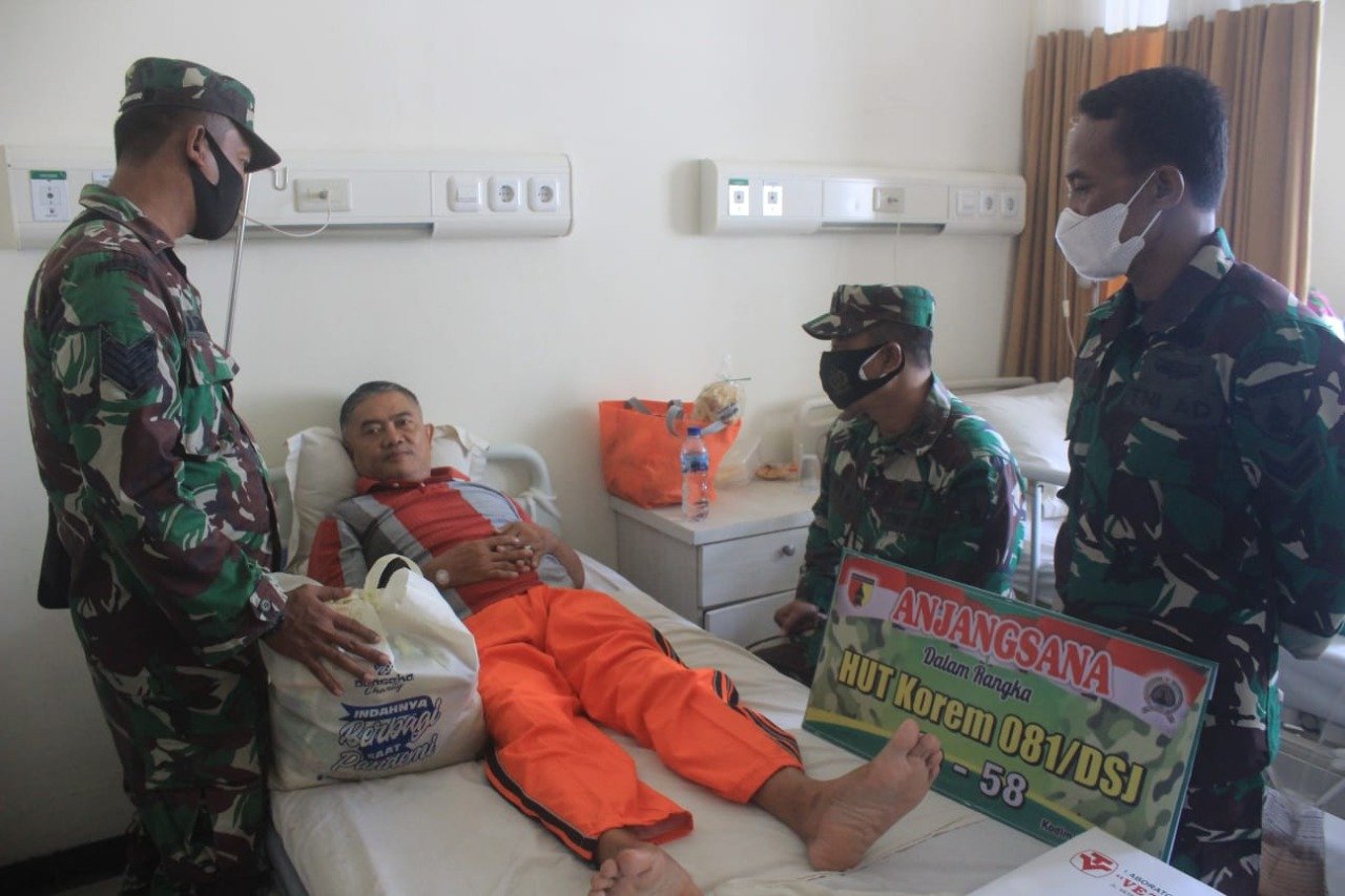 Blitar – Serangkaian kegiatan mewarnai perayaan HUT ke-58 Korem 081/DSJ Tahun 2021. Setelah sebelumnya menggelar kegiatan bakti sosial donor darah, kini Kodim 0808 menggelar anjangsana ke beberapa rumah anggota Kodim 0808/Blitar yang sedang sakit menahun, Rabu (17/11/2021).