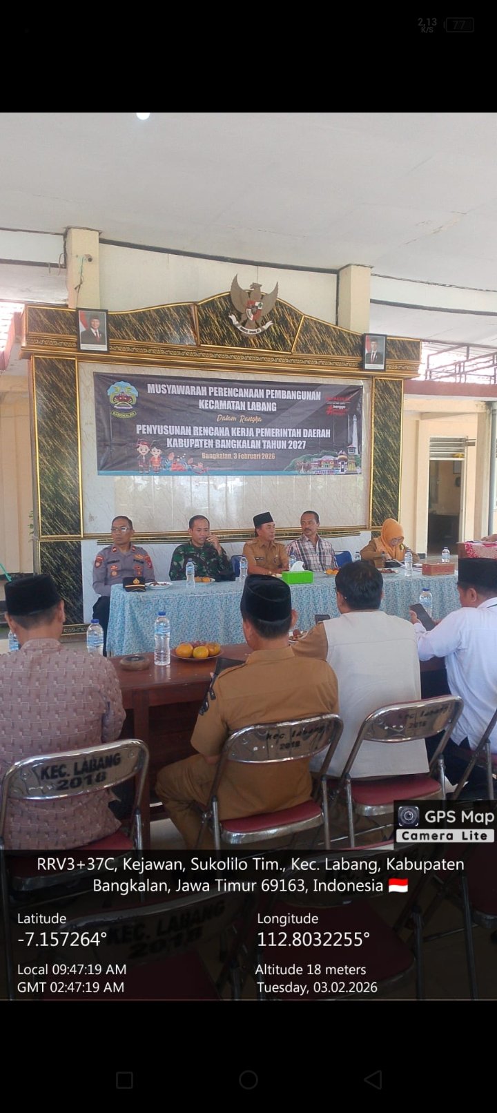 BANGKALAN, (CNK) – Koramil 0829-07/Labang menghadiri kegiatan Musyawarah Perencanaan Pembangunan (Musrenbang) Kecamatan Labang dalam rangka penyusunan Rencana Kerja Pemerintah Daerah (RKPD) Kabupaten Bangkalan Tahun 2027. Kegiatan tersebut dilaksanakan pada Selasa, (3/2/26), bertempat di Pendopo Kecamatan Labang, Desa Sukolilo Timur, Kecamatan Labang, Kabupaten Bangkalan.