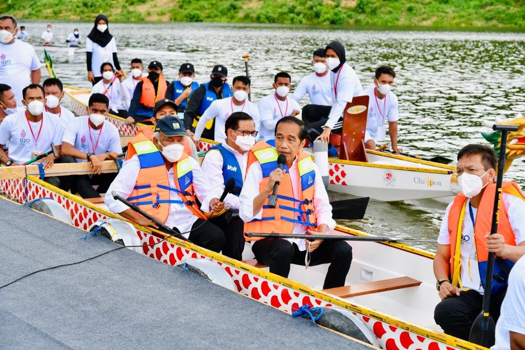 Kolaka – Presiden Joko Widodo meresmikan Bendungan Ladongi di Kabupaten Kolaka Timur, Provinsi Sulawesi Tenggara, pada Selasa, 28 Desember 2021. Berbeda dari biasanya, kali ini Presiden Jokowi menyampaikan pernyataan peresmian sambil menumpangi perahu naga di bendungan tersebut.
